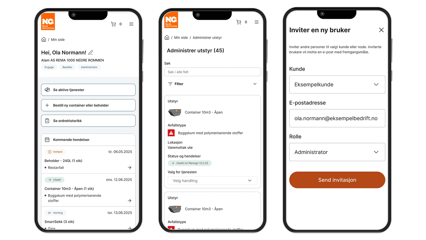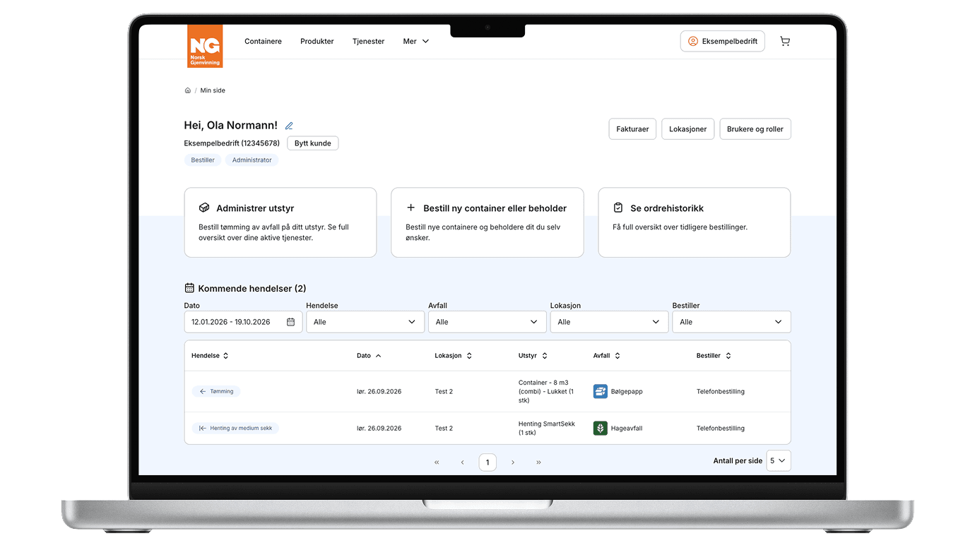 Med digitale løsninger fra Norsk Gjenvinning kan du enkelt se ditt kundeforhold, bestille tjenester og produkter. I tillegg har du enkel tilgang til din avfallsstatistikk og rapportering.